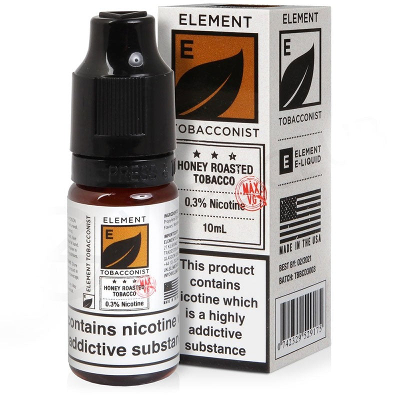 Honey Roast Tobacco e-liquid by Element Tobacconist is a tobacco blend with sweet notes. A woody tobacco base, is infused with sweet and caramelised nutty undertones for a full-bodied, earthy vape with a sugary aftertaste.