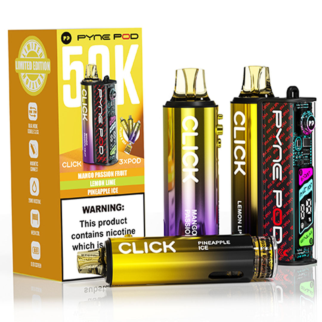 Satisfy your craving with the Pyne Pod Click 50k, a sophisticated pod system engineered for exceptional durability. Its efficient dual mesh coil design supports up to 50,000 puffs, providing long-lasting performance. The kit comes complete with three flavour pods and refill containers, guaranteeing prolonged enjoyment and consistently rich, flavourful vapor.