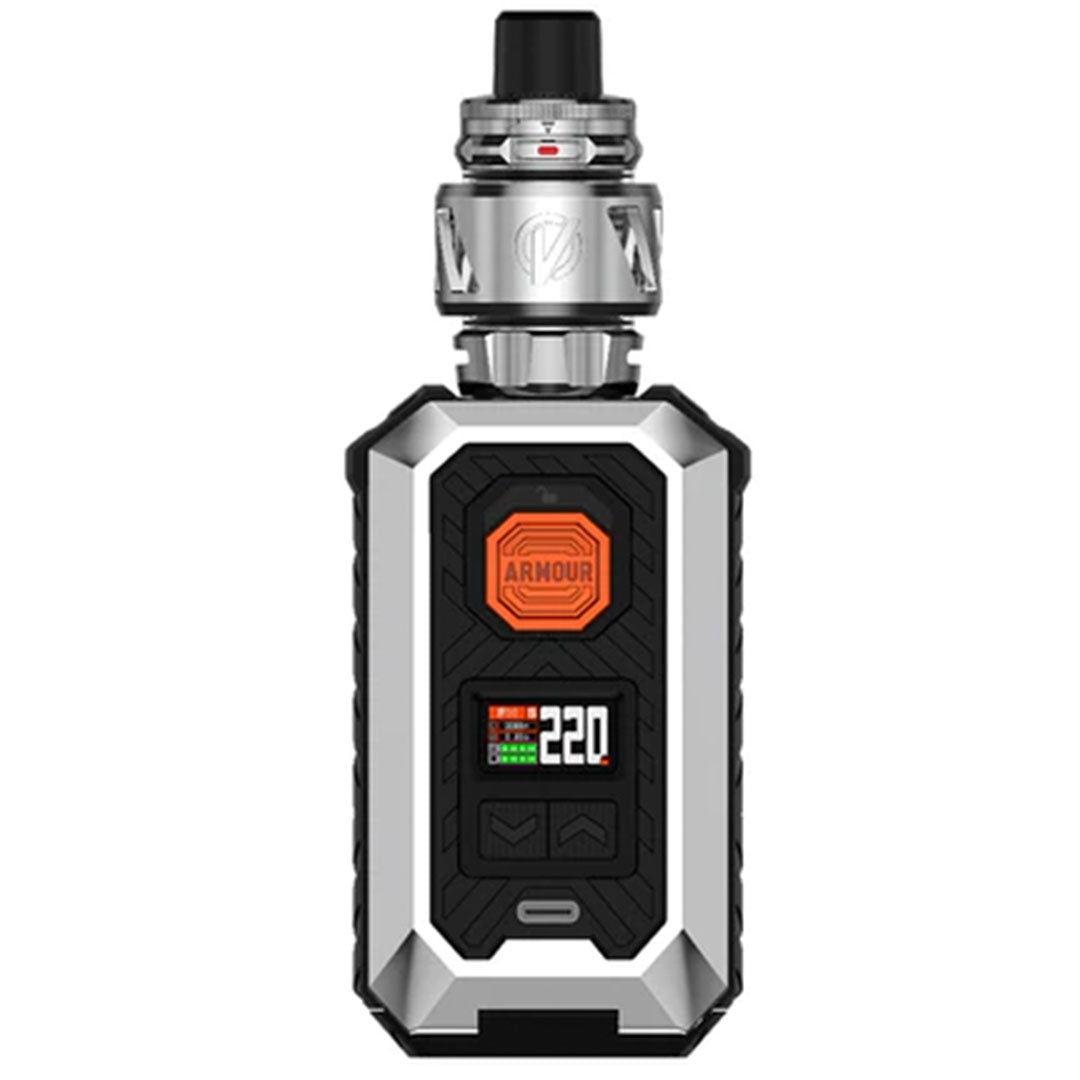 The Vaporesso Armour Max is a configurable DTL kit that offers a rugged aesthetic. It accepts either dual 18650 or 21700 batteries to produce wattages between 50 and 220W, designed for DTL vaping. It comes with a 2ml iTank 2 and two mesh coils.