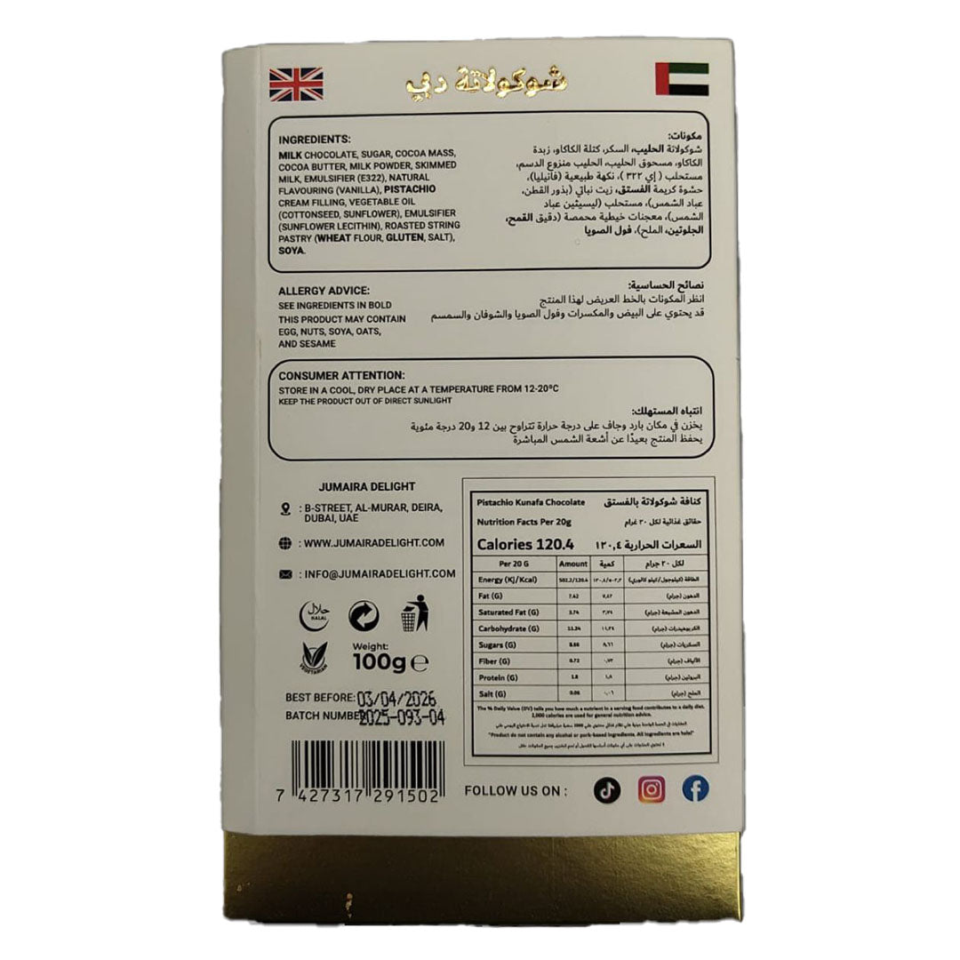 Viral Dubai Kunafa Pistachio Chocolate Bar - Jumaira Delight 100g