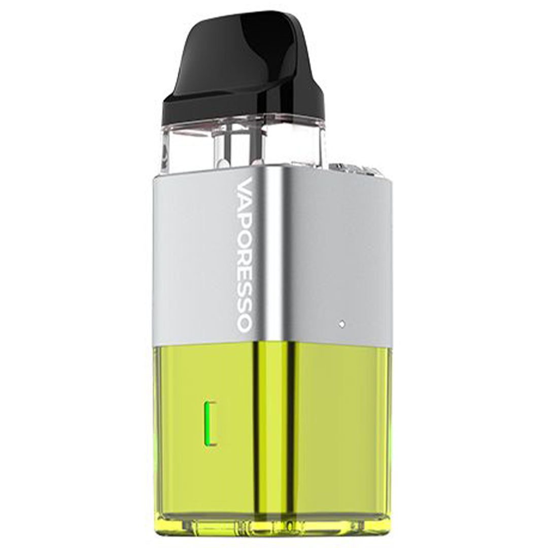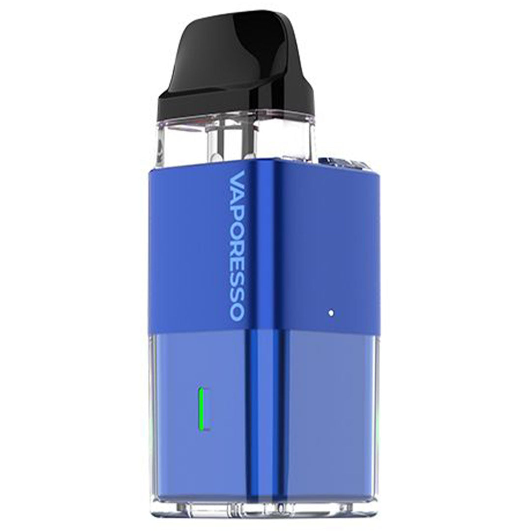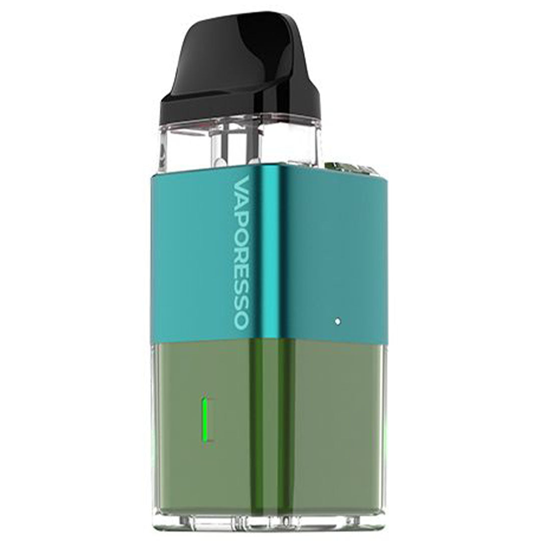 The Xros Cube Pod Kit by Vaporesso features a transparent coating and cube lighting, allowing for easy viewing of battery percentage. The device will illuminate green when the battery is at 70% to 100%, blue at 30% to 70%, and red at 30% or below.